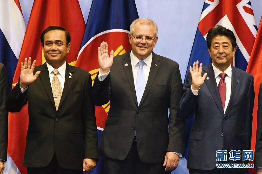 11月14日,泰国总理巴育(左)、澳大利亚总理莫里森(中)与日本首相安倍晋三在新加坡出席第二次“区域全面经济伙伴关系协定”领导人会议。 新华社发(邓智炜 摄)