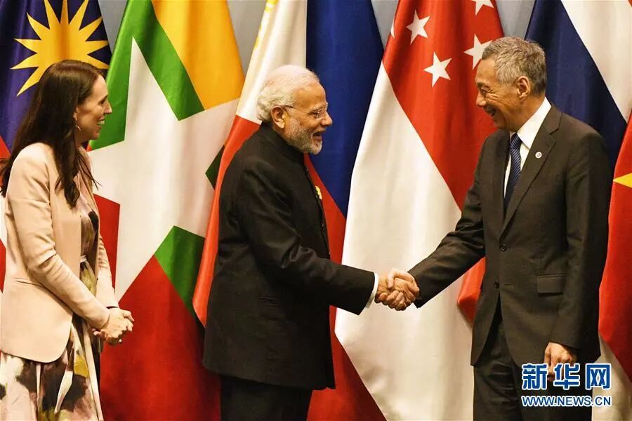 11月14日,新加坡总理李显龙(右)、印度总理莫迪(中)和新西兰总理阿德恩在新加坡出席第二次“区域全面经济伙伴关系协定”领导人会议。 新华社发(邓智炜 摄)