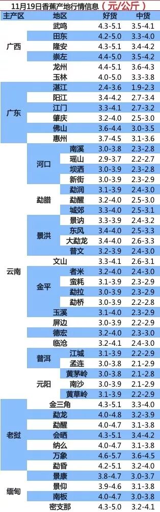 广西产区今日蕉价稳中微跌,好货主流价格位于4.2-5.0元/公斤之间。受即将到来的寒潮影响,此前一周有部分种植户急于出货,但市场整体走货情况不佳,故而广西近日价格出现下跌,整体表现较为混乱。 广东产区今日蕉价表现平稳,包括阳江、惠州在内的部分地区价格出现微涨,但幅度并不明显。 云南产区经历了此前一周的价格下跌,目前有逐渐回稳的趋势,好货主流价格多位于3.0-4.0元/公斤之间,极少部分好货可达4.2元/公斤。 老挝产区今日价格表现平稳。业内人士指出,此前一周部分广西种植户担心寒潮、急于出货,全国香蕉价格均略显混乱,但近日老挝气温较低、香蕉成熟速度放缓、基地出货压力较小,故而有不少老挝基地选择暂时留货观望,整体出货量不大,未来几天或将有所恢复。