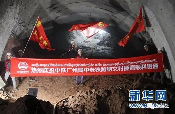 2018年6月12日,老挝乌多姆赛省,工作人员在庆祝纳文村隧道成为中老铁路第二座贯通的隧道(图自:新华网 梁文东 摄)