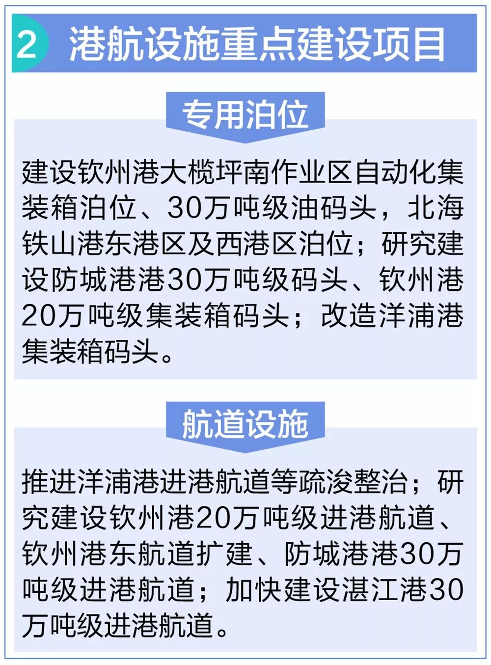 加强港航设施建设。积极推进钦州、洋浦等港口建设大型化、专业化、智能化集装箱泊位,提升集装箱运输服务能力;大力推进防城港等港口建设大型化干散货码头,促进干散货作业向专业化、绿色化方向发展。有序推进进港航道疏浚整治,改善通航条件。