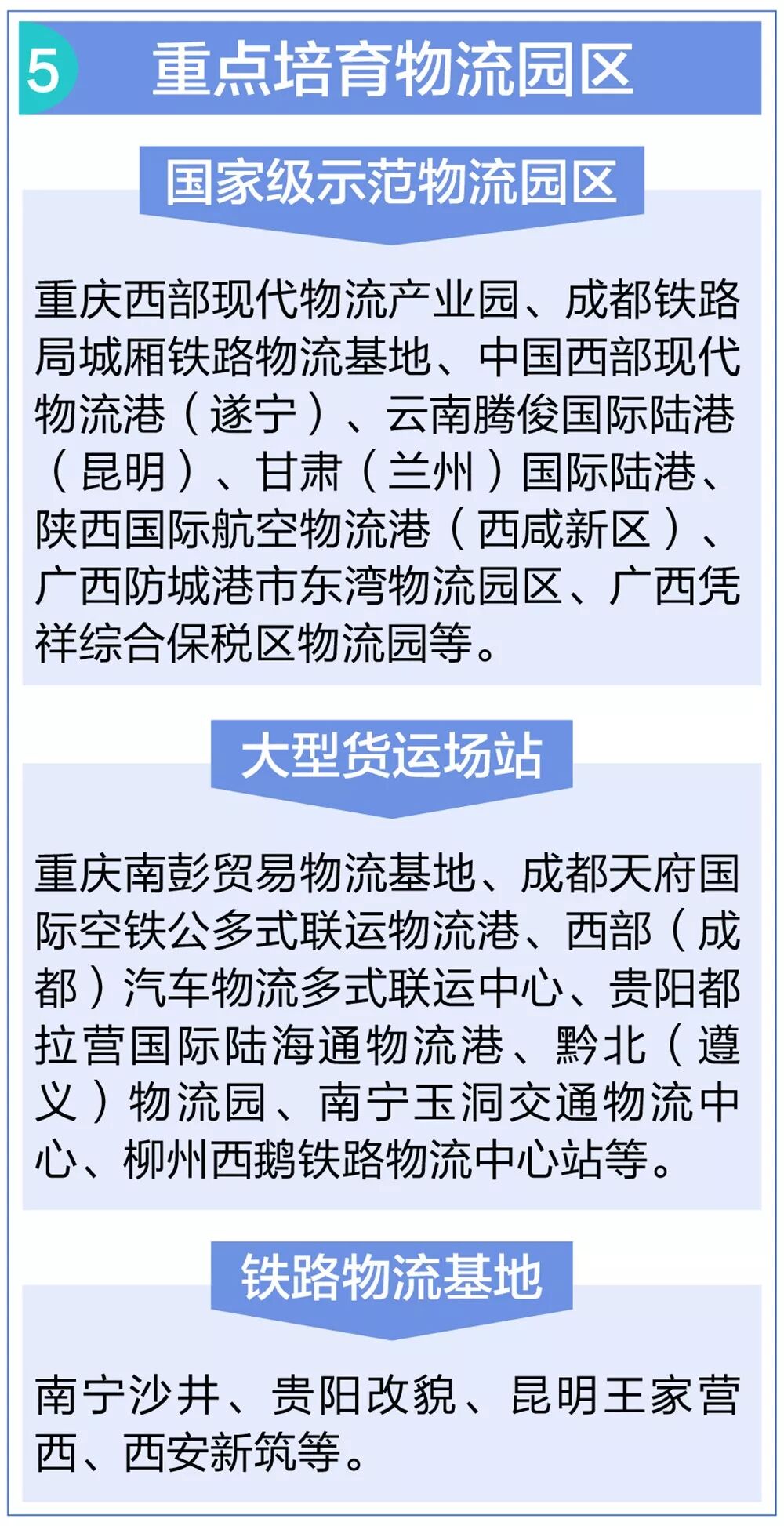 提高装备技术水平。积极推进新技术在通道沿线重点园区应用,支持重庆、成都等物流枢纽建设自动化场站、智能型仓储等智慧物流设施。加快推进现代化、信息化、智能化物流基础设施建设。优化调整高铁车站和动车货运功能,积极发展高铁快运。支持节能环保型仓储设施建设与设备、材料应用。积极推进内地重要物流枢纽“无水港”建设,高起点建设冷藏物流设施,重点发展产地冷库、流通型冷库、立体库等,加快冷藏集装箱、空铁联运集装箱等新型多样化载运工具和转运装置的研发与推广应用。