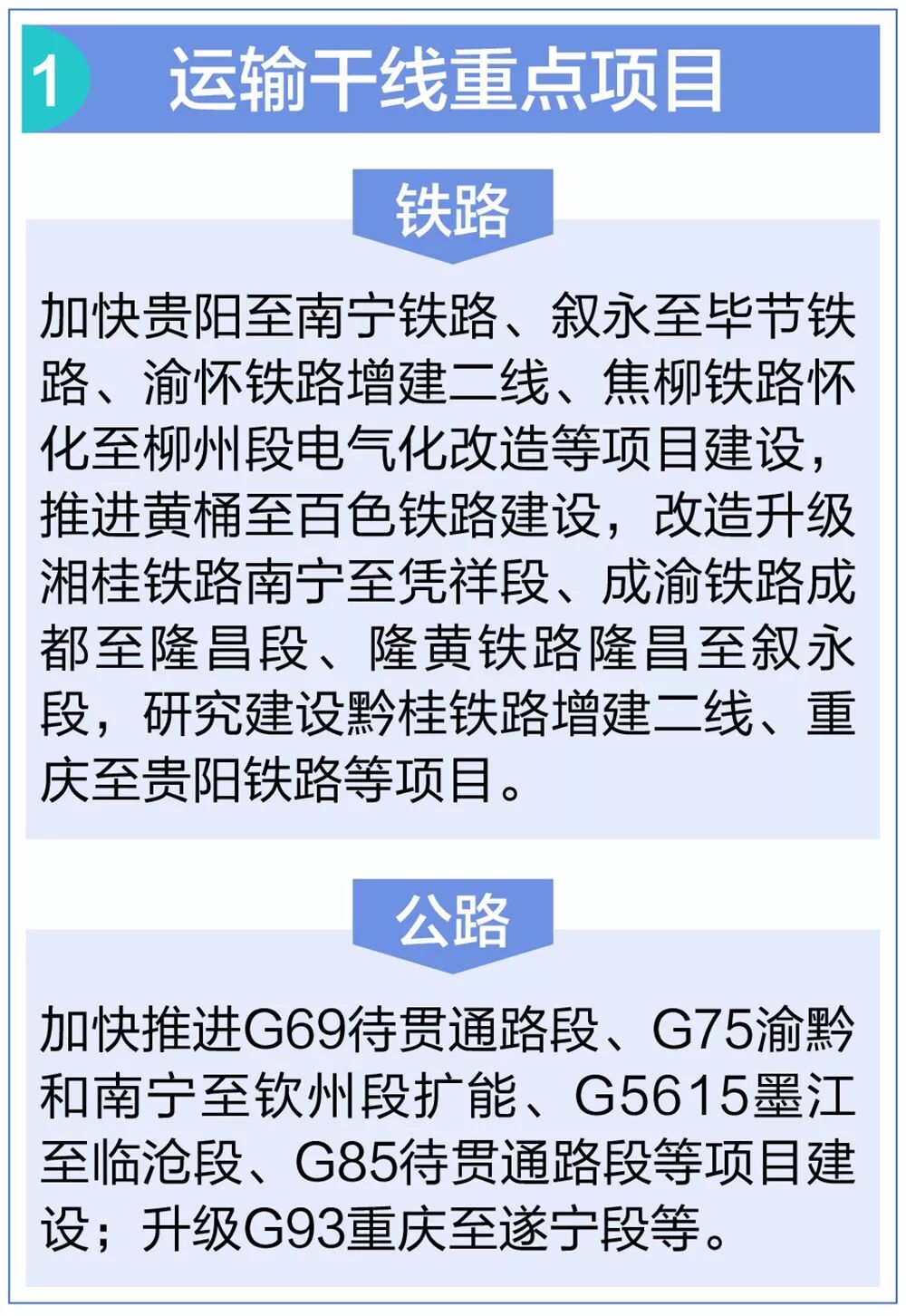 相互补充的铁路运输网络。中线着力提升通道能力,加快贵阳至南宁等新线建设;东线着力加快既有铁路改造提升,推进渝怀铁路增建二线等项目建设;西线加强补齐通道短板,建设黄桶至百色等铁路项目。研究建设双层集装箱运输通道。完善公路运输网络。进一步扩大公路网覆盖面,有效扩大主通道辐射范围。加快国家高速公路、普通国省干线瓶颈路段扩能改造和待贯通路段建设,有序建设一批对通道具有重要支撑作用和通往港口、口岸的地方高速公路项目。加快电子不停车收费系统(ETC)推广应用,加快取消高速公路省界收费站,实现不停车快捷收费,提升高速公路通行效率。