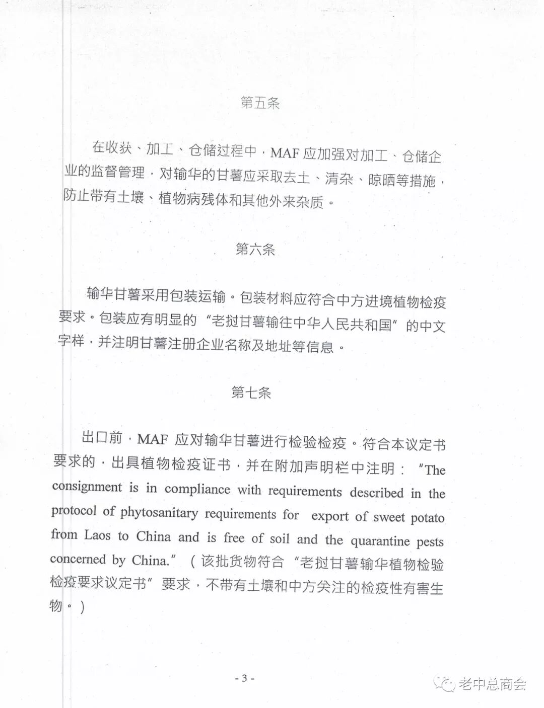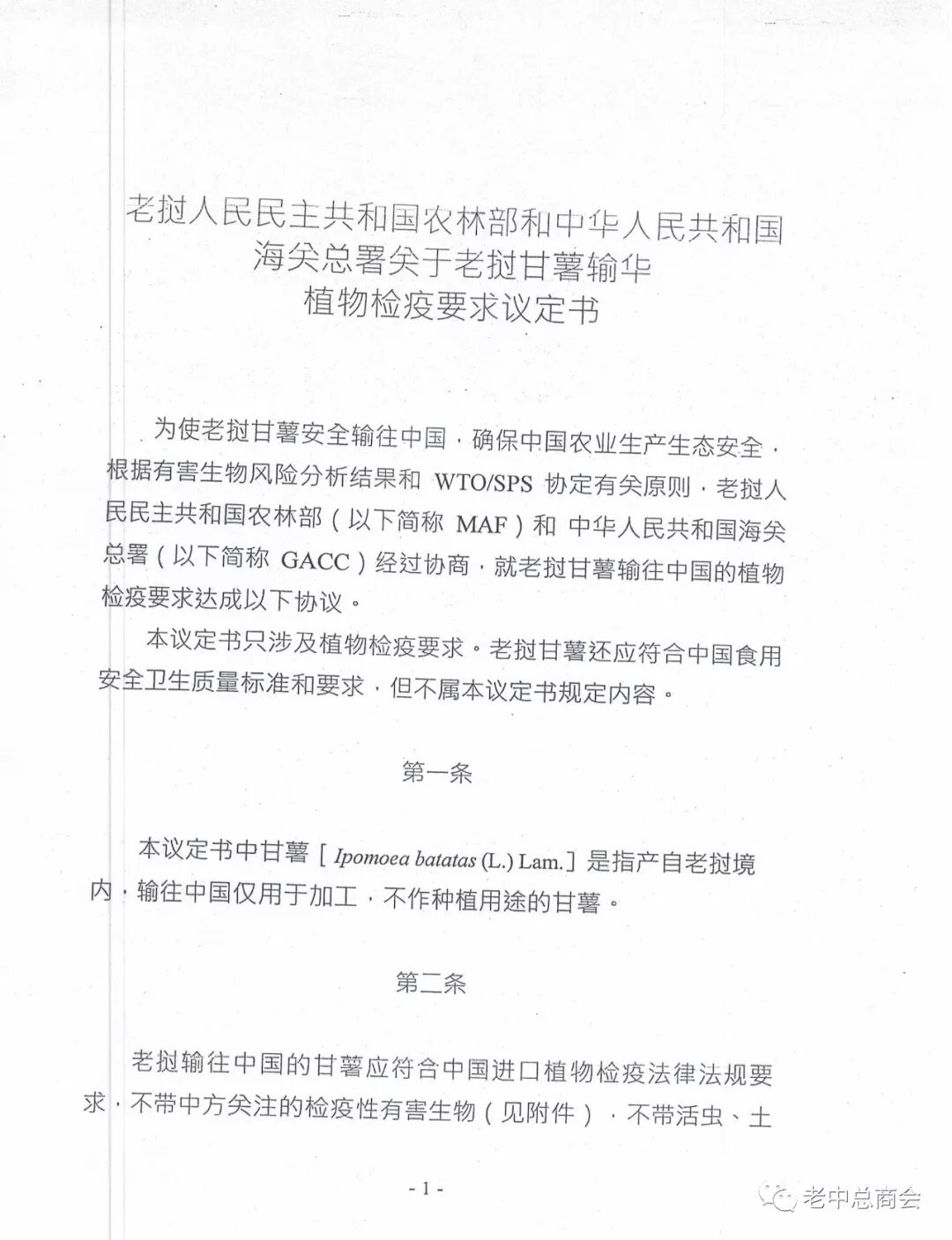 为使老挝甘薯安全输往中国,确保中国农业生产生态安全,根据有害生物风险分析结果和WTO/ SPS协定有关原则,老挝农林部和中国海关总署经过协商,就老挝甘薯输往中国的植物检疫要求达成以下协议。