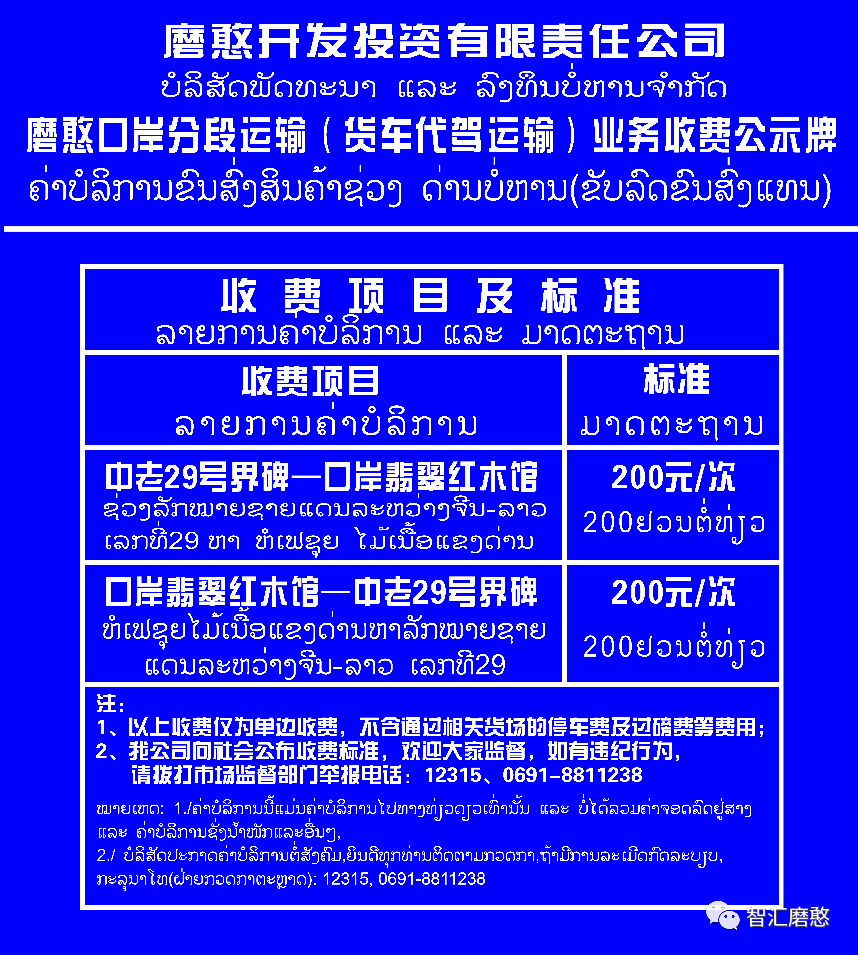 为进一步确保新冠肺炎疫情防控期间跨境货物运输畅通,根据省应对疫情工作领导小组指挥部第15号《关于严防境外疫情经陆路水路输入的通告》精神及《关于进一步加强疫情防控期间跨境货物运输管理工作的通知》(云应疫指办发〔2020〕40号)等政策指示,统筹推进口岸疫情防控和口岸经济社会发展的工作,降低磨憨口岸装运运输成本,对现在磨憨口岸分段运输(货车代驾运输)业务收费再次降价公示。