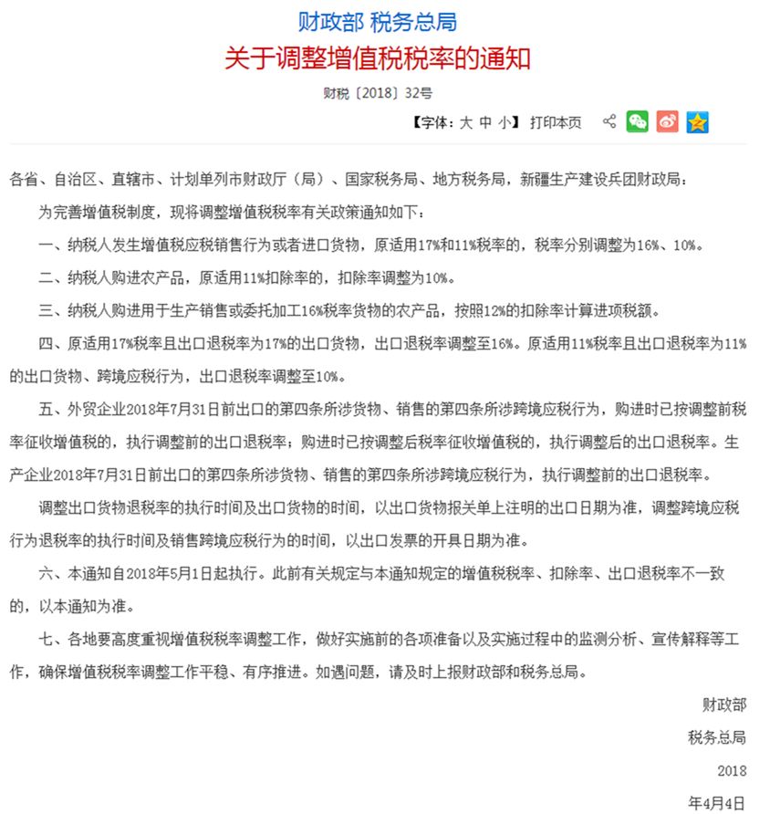 4月4日,国家财政部发布通知,从2018年5月1日起,将纳税人发生增值税应税销售行为或者进口货物,原适用17%和11%税率的,分别调整为16%、10%。