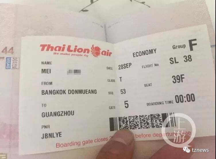 9月28日凌晨,梅先生自己花了3215泰铢购买狮航SL38被泰方遣返回广州。