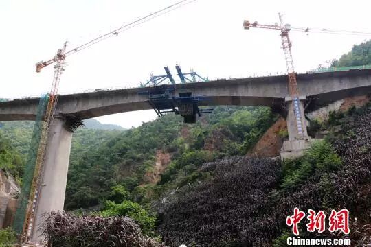 大桥连接两座大山,跨越深沟峡谷,两侧山体坡度在70度以上,在狭小的峡谷间施工,交通不便,大型机械无法投入,建设难度极大。